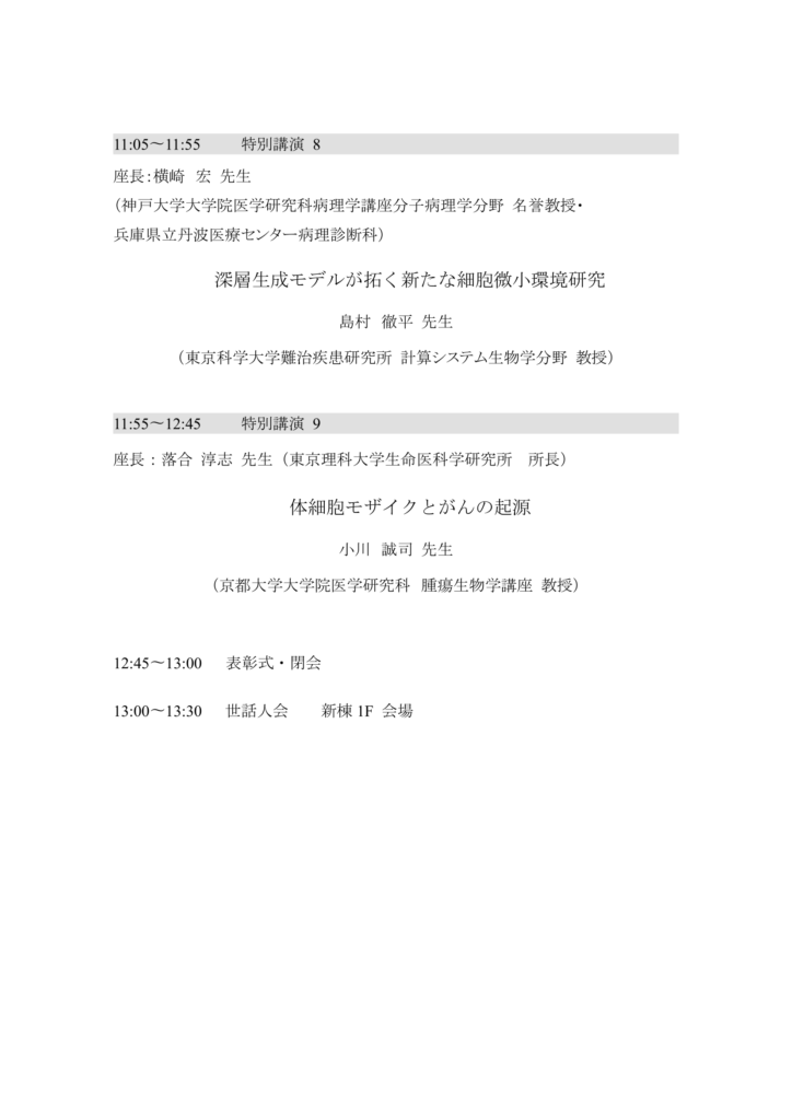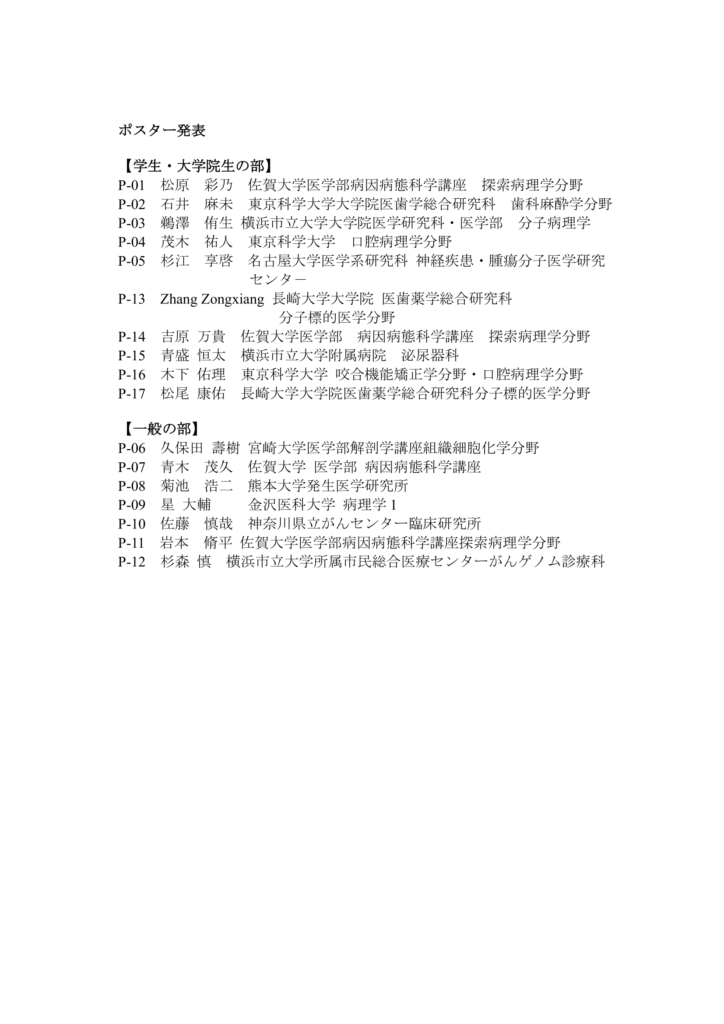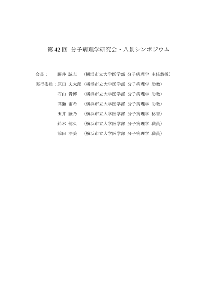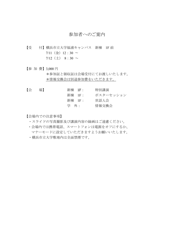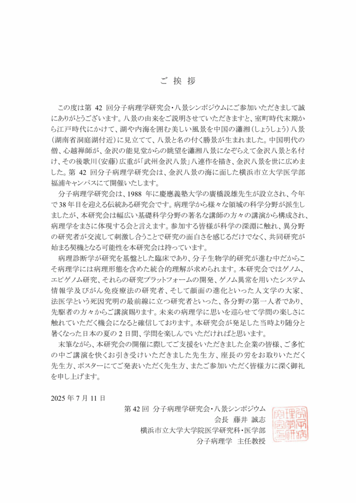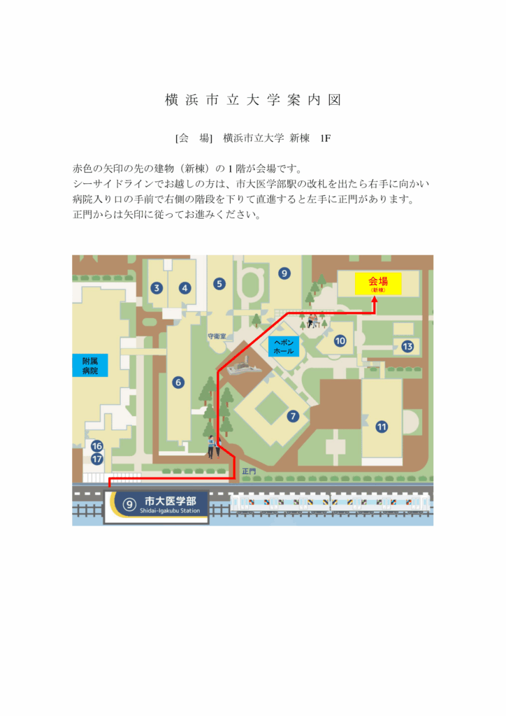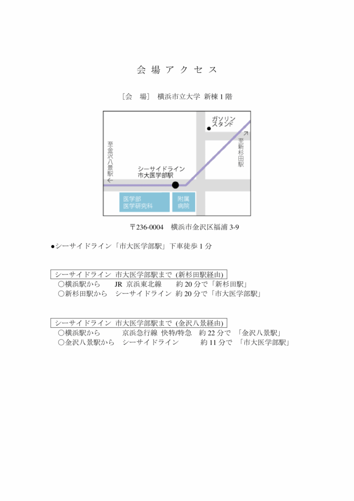 第42回分子病理学研究会八景シンポジウム →簡易プログラム(会場が変更になりました) 第42回分⼦病理学研究会「八景シンポジウム」開催のお知らせ 会期 2025年7月11日(金)2025年7月12日(土) 会場 横浜市立大学医学部 ヘボンホールアクセス ⇒ 福浦キャンパス・附属病院 | YCU 横浜市立大学 参加費 一般 3,000円学部学生/大学院生 無料 参加登録 ⇒参加登録は下部の参加登録フォームよりお申込みください。*2025年7月4日締め切り ポスター発表 ポスター発表者へのご案内 主催 分子病理学研究会 問い合わせ先 事務局 横浜市立大学大学院医学研究科・医学部 分子病理学TEL:045-787-2587 参加登録フォーム 第42回分子病理研究会「八景シンポジウム」にご参加いただける方は下記のフォームにご入力の上、送信ボタンを押して下さい。 氏名* フリガナ* 施設名 メールアドレス* 参加者の属性*一般学部学生/大学院生 参加日程について 両日とも参加する1日目のみ参加する2日目のみ参加する 情報交換会の参加の有無について(参加費が別途必要) 参加する参加しない ポスター発表の有無 参加する参加しない ポスター発表の抄録記入欄 ファイルの添付(PDF/PNG/JPG) メッセージ (任意) 入力確認ボタン* ←チェックを入れて送信ボタンを押して下さい。 宿泊される方へのホテルの案内 研究会の開催会場近隣のホテルをご紹介します。 ホテル最寄り駅「産業振興センター駅」から研究会場の最寄り駅「市大医学前」までシーサイドラインで3分 横浜テクノタワーホテル 横浜テクノタワーホテル【公式】|横浜市金沢区・八景島シーパラダイス近くのホテル 京浜急行「金沢八景駅」乗り換え横浜シーサイドライン 「産業振興センター駅」下車JR「新杉田駅」乗り換え横浜シーサイドライン 「産業振興センター駅」下車